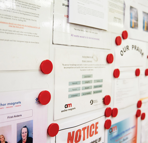 Magnets are commonly used in the workplace to display notices, secure documents and in conjunction with receptive boards.